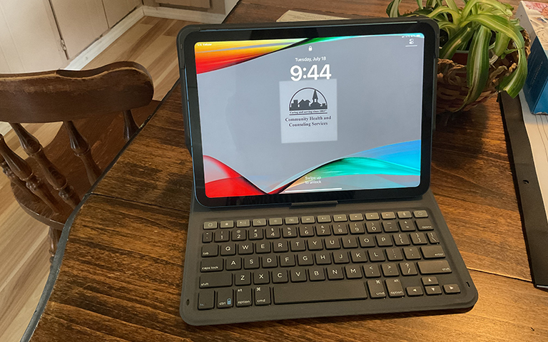 An iPad purchased from UScellular that CHCS attaches a Bluetooth keyboard for easy typing by field clinicians.
