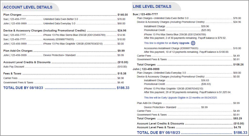 These two sections list all the plans, device and accessory installments, credits, fees, etc., at the account and line level. It’s a fully detailed view of what you’re paying each month for each line of service.